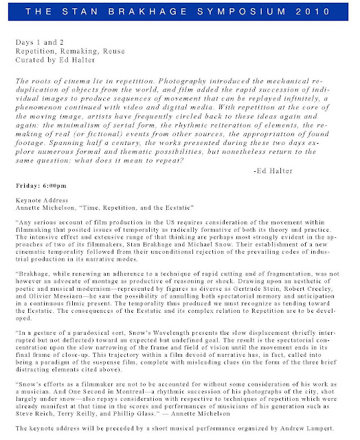 "The Stan Brakhage Symposium, already a tradition in the not very traditional world of avant-garde filmmaking, will again be hosted this year by the University of Colorado at Boulder. In a weekend dedicated to the exploration of new ideas in cinema art, guest curator Ed Halter will explore the role of repetition/reuse/and the remake in contemporary artists’ works, and CU faculty professors Christina Battle and Jennifer Peterson will investigate the relationship of the amateur and the Avant-Garde. Presenters will include Ed Halter, art historian David Joselit, Andy Lampert, Annette Michelson, Sylvia Schedelbauer, Phil Solomon, and Elisabeth Subrin.